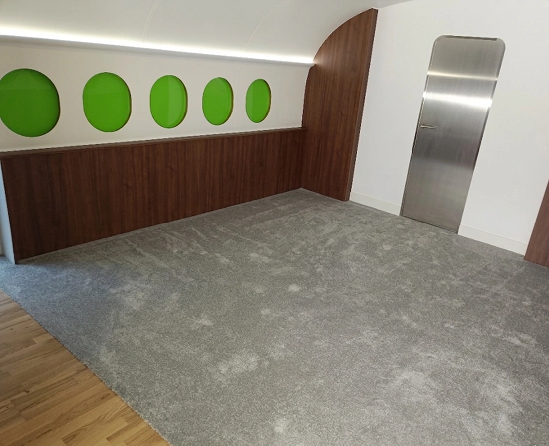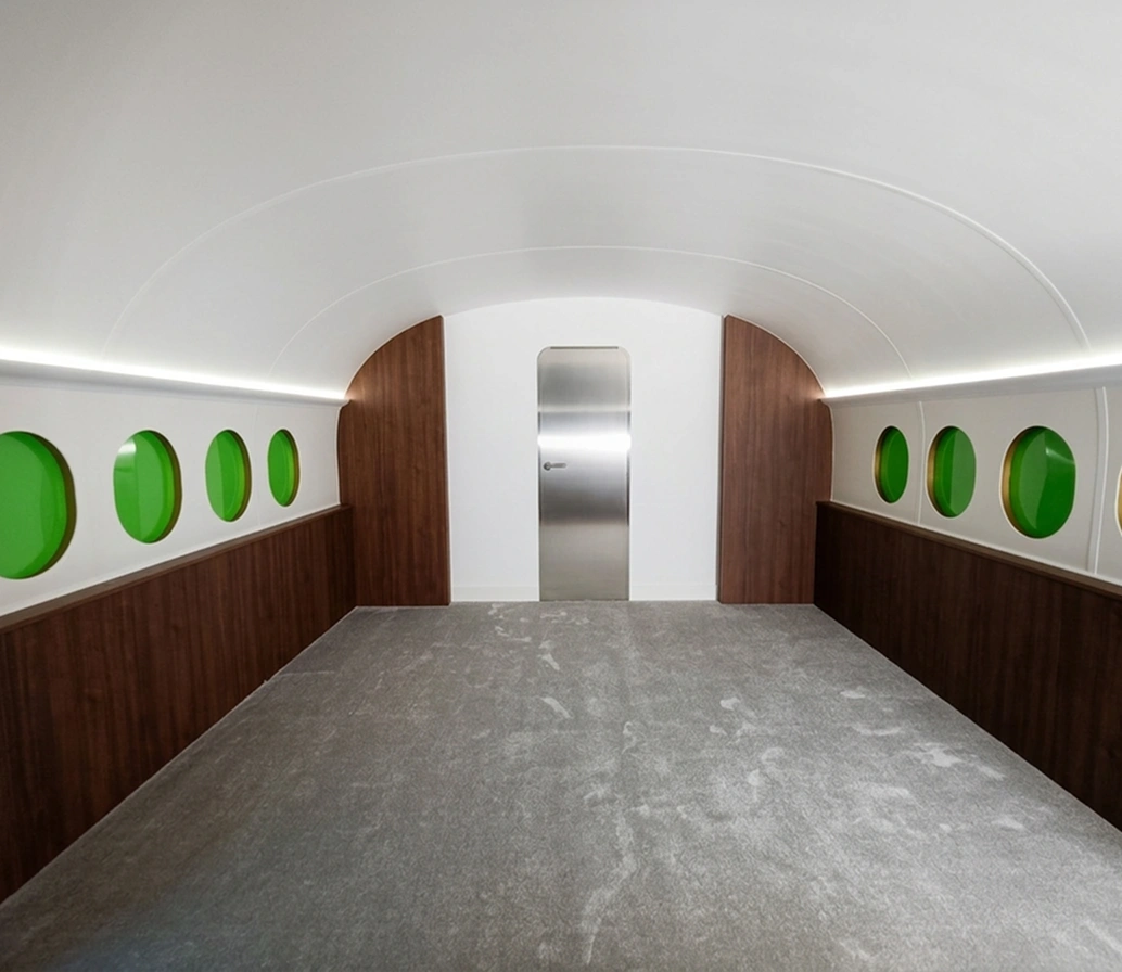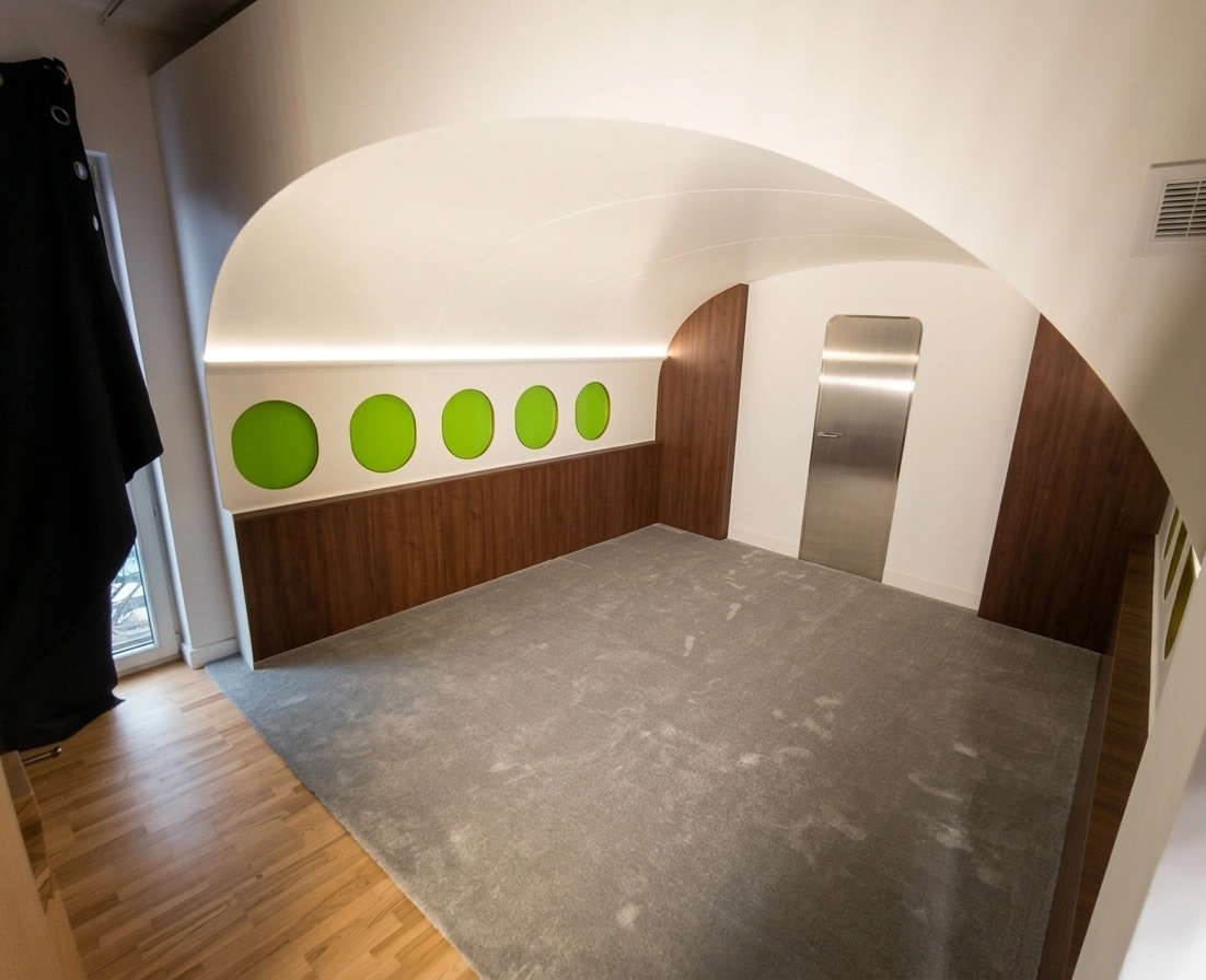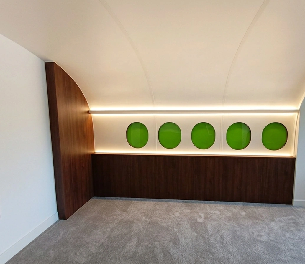 Zaprojektowaliśmy i wykonaliśmy studio podcastowe inspirowane wnętrzem samolotu – przestrzeń nagrań, która od razu buduje klimat i wyróżnia materiał wideo na tle standardowych realizacji.